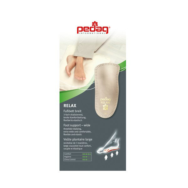 Peus plans plantilles pedag relax tres quarts de longitud, per a les persona amb els peus amples que necessiten cada mil·límetre de la sabata o bé per a calçat amb la puntera estreta que no entra una plantilla sencera, revestida en cuir de primera qualitat amb coixinet al metatars per una major relaxació, amb un arc elàstic i flexible